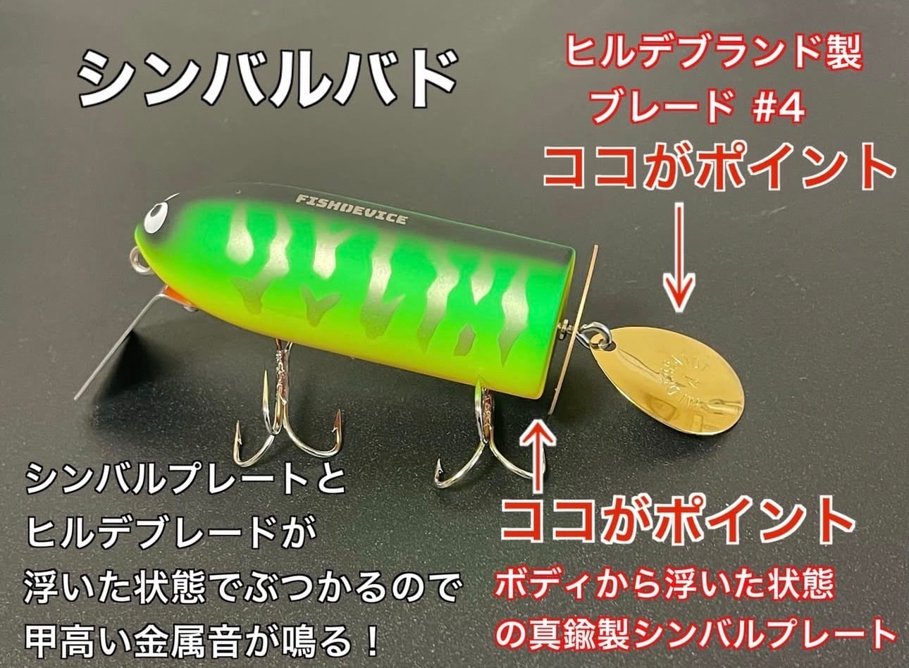ボディーから浮かせた真鍮製シンバルプレートとヒルデブランド製コロラドブレードがぶつかることで甲高い金属音をかなでる大人気ルアーのバド系ノイジープラグのシンバルバド。